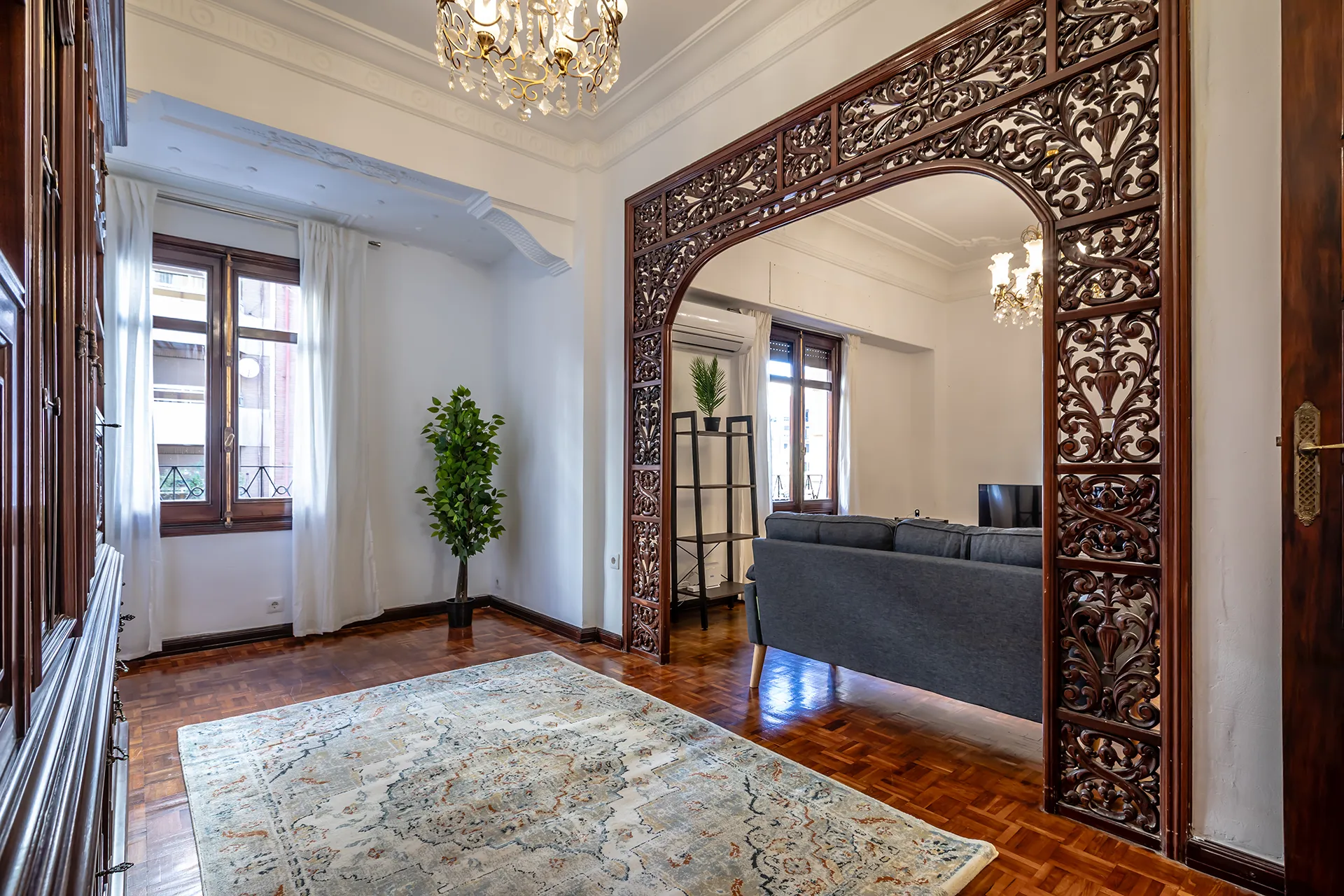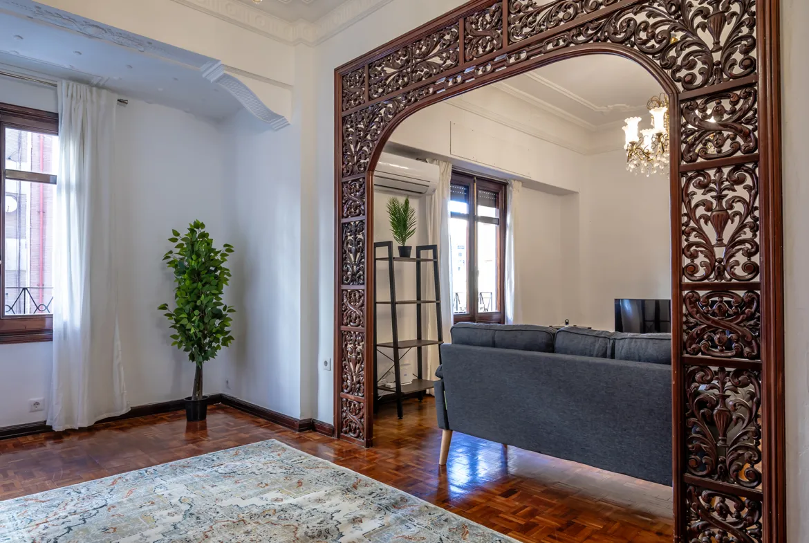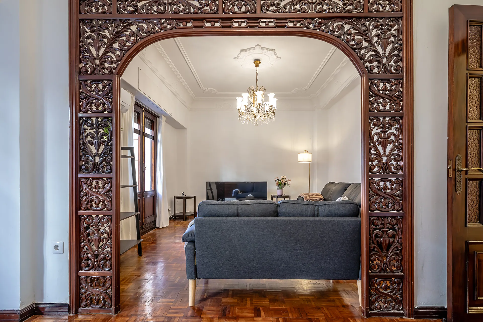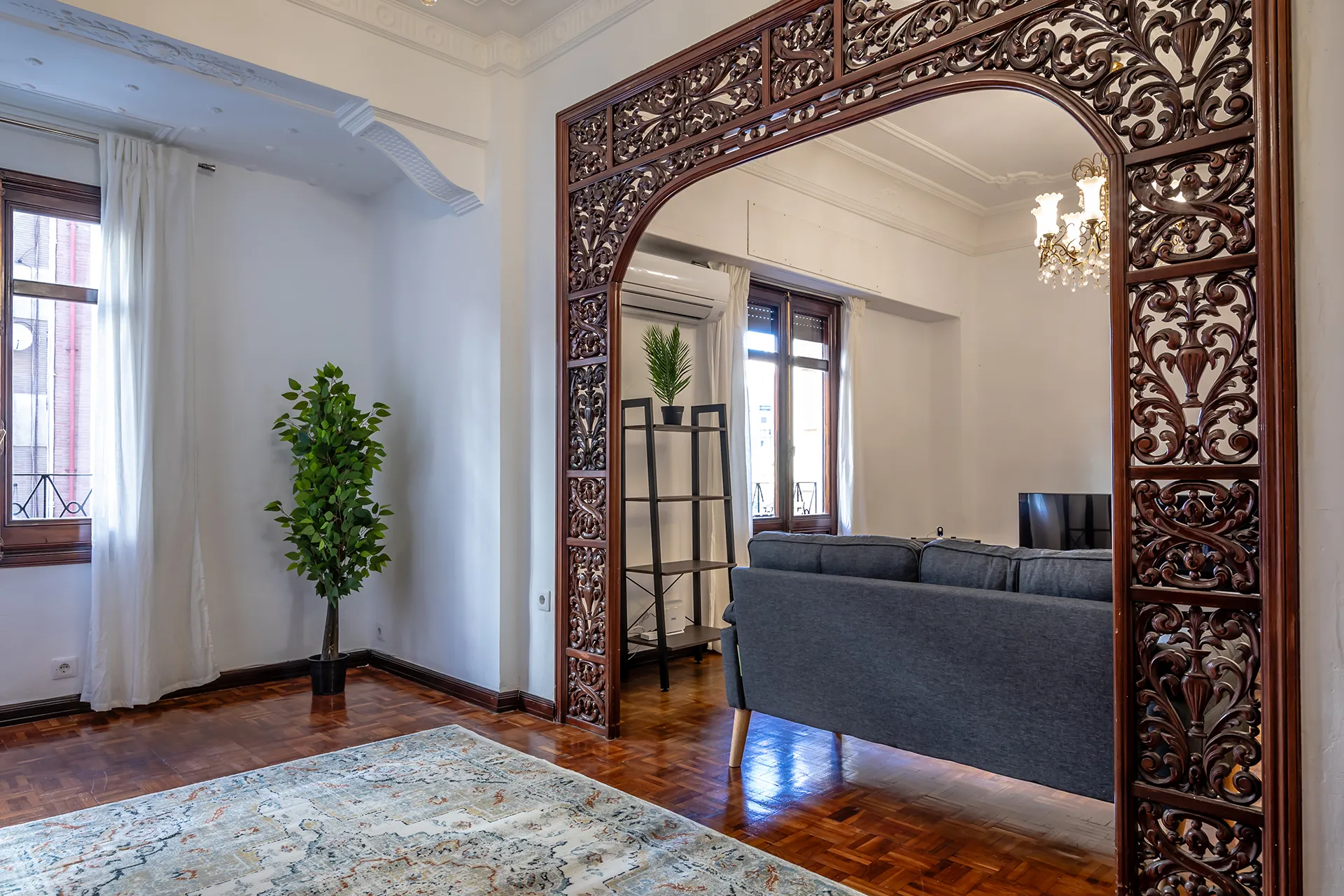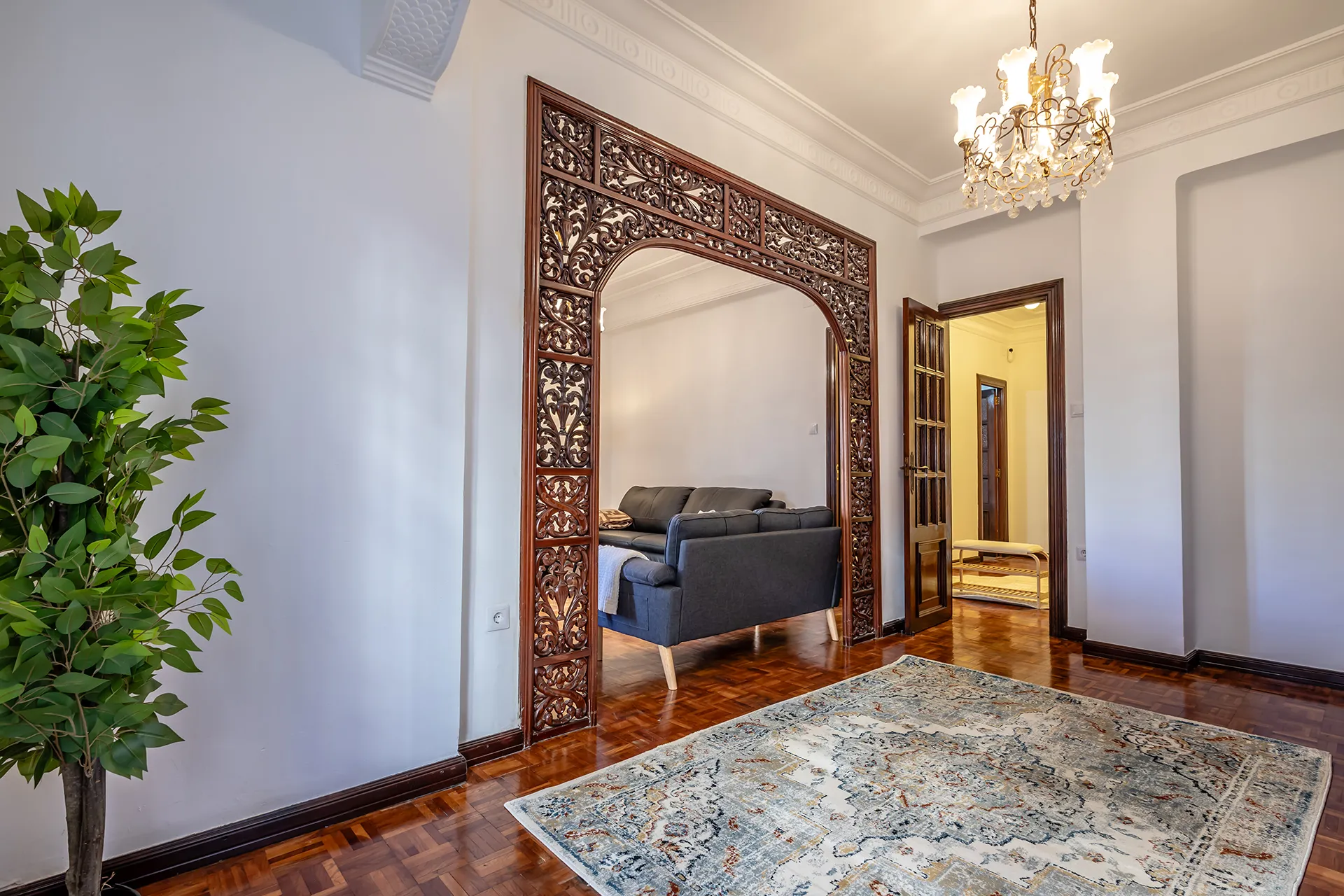 The apartment features a large, light-filled living room with a beautiful original wooden arch, adding timeless charm to the space. From here, you can access the balcony, perfect for enjoying morning coffee or relaxing after a long day.