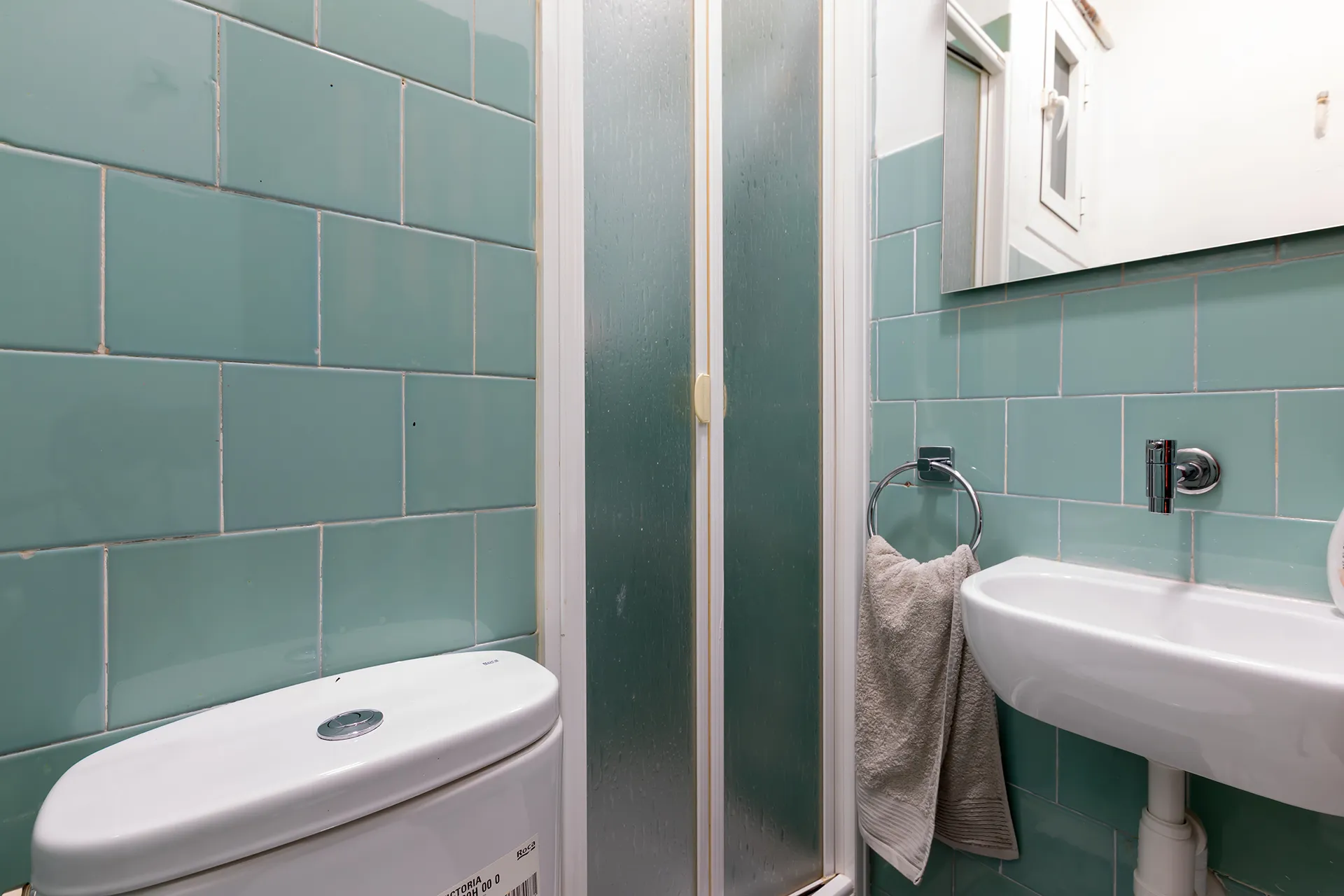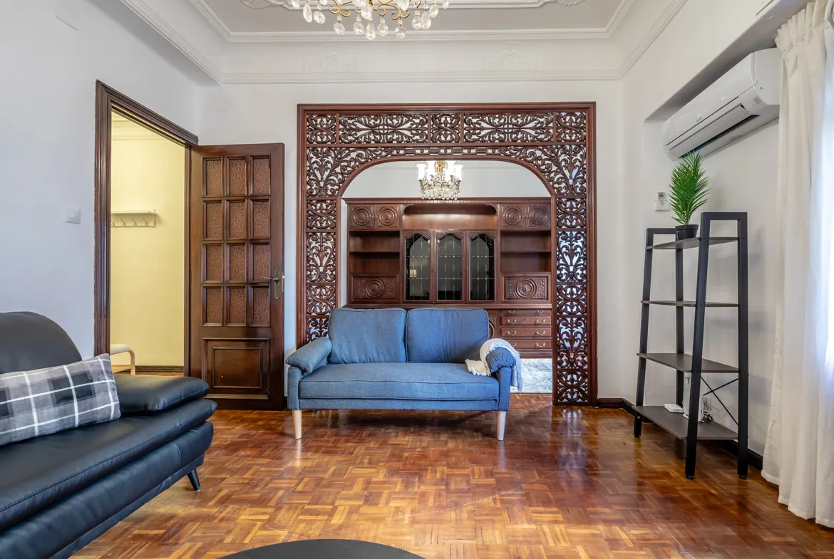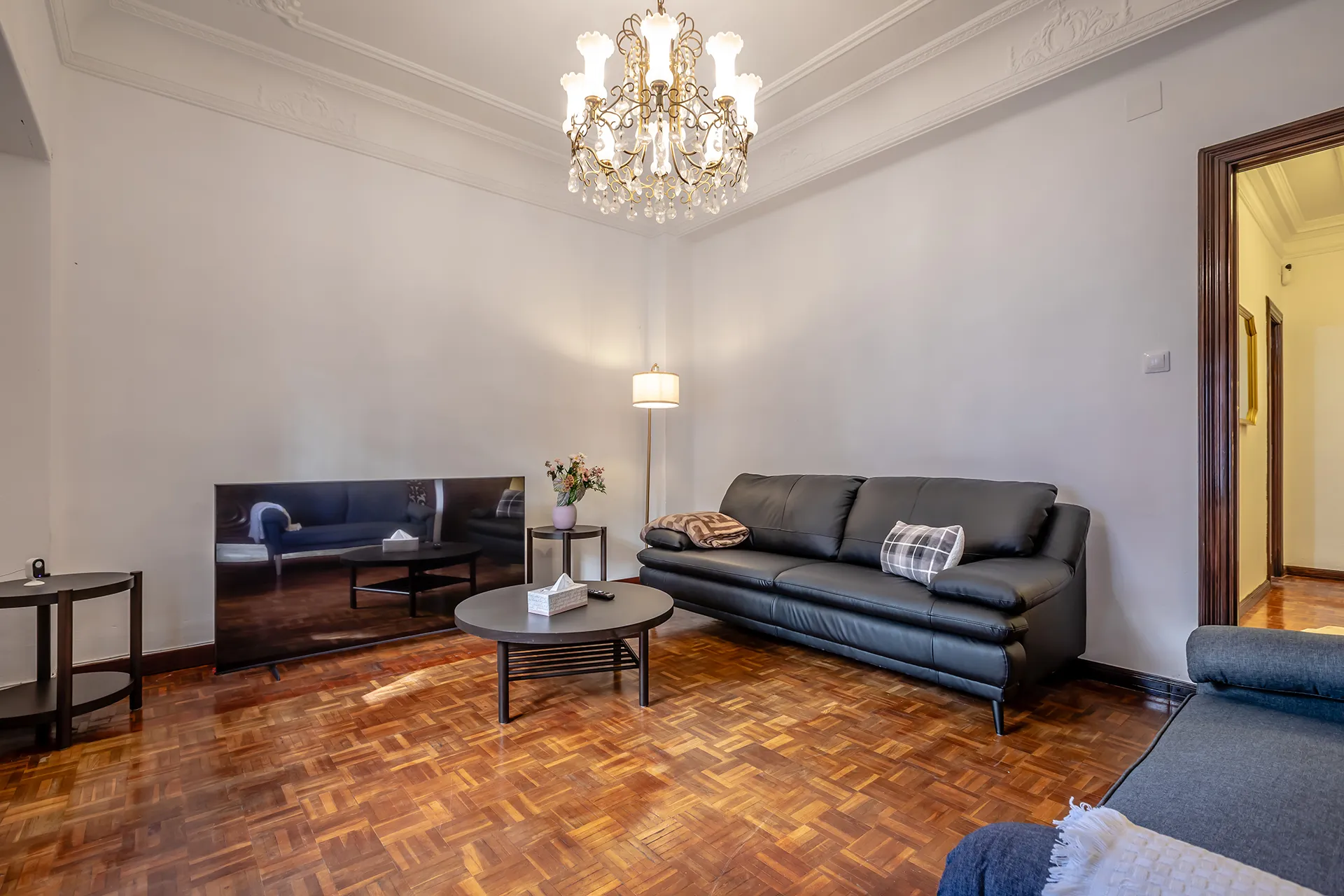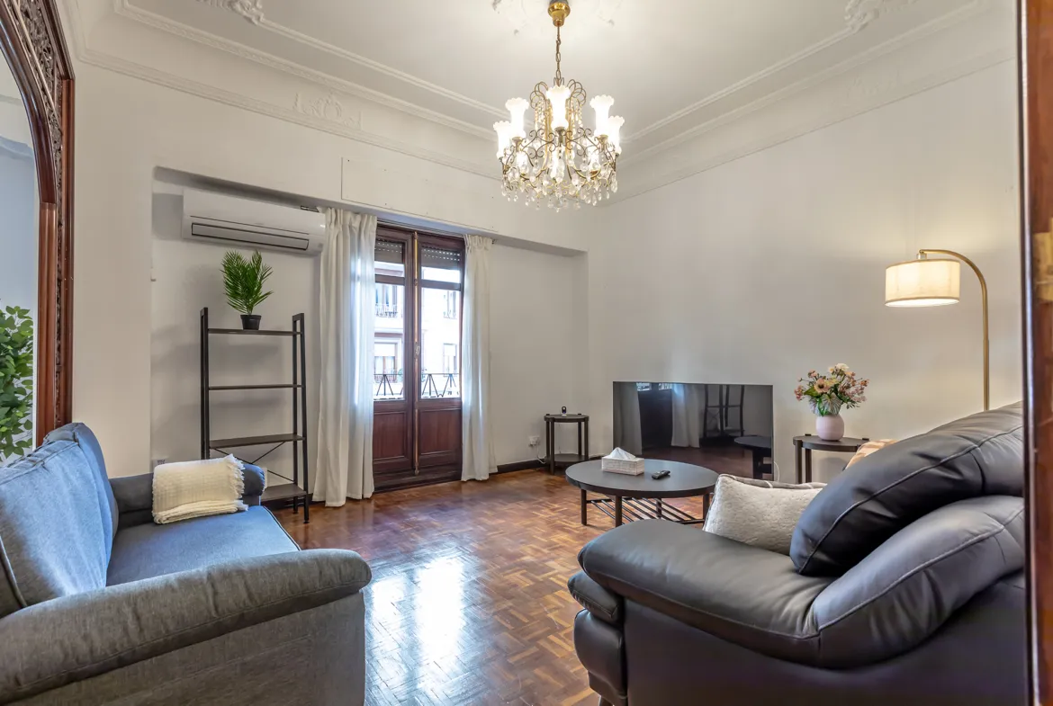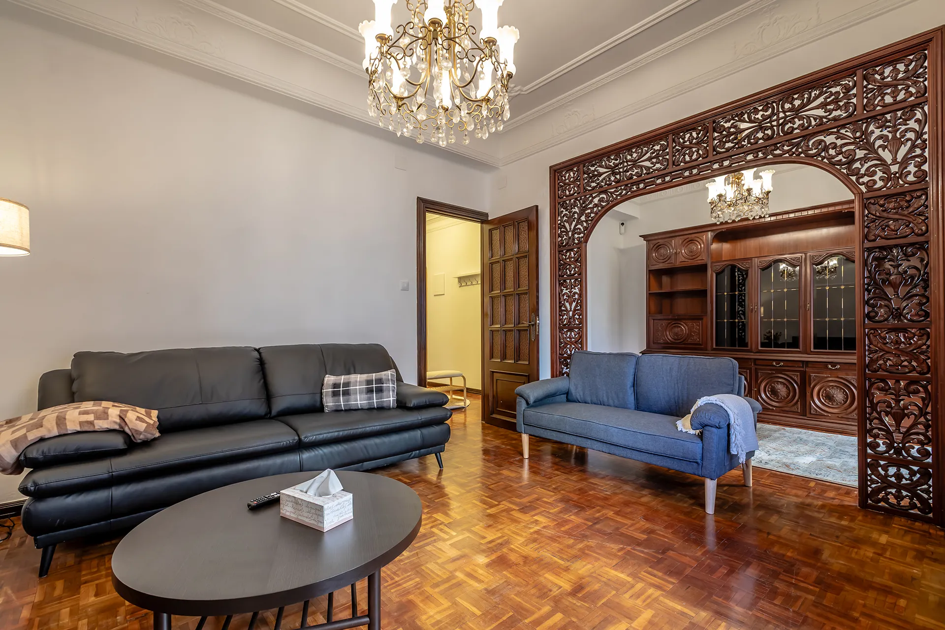 The apartment features a large, light-filled living room with a beautiful original wooden arch, adding timeless charm to the space. From here, you can access the balcony, perfect for enjoying morning coffee or relaxing after a long day.