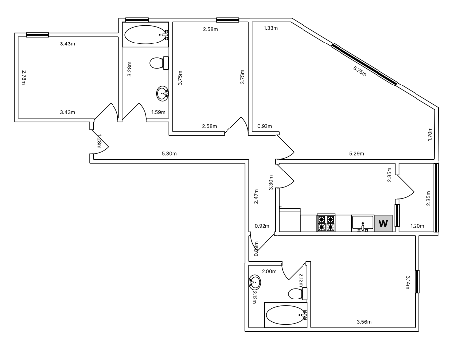 The corner living-dining room enjoys excellent natural light and offers panoramic views over the streets, creating a particularly pleasant and welcoming space. The kitchen has access to a balcony, which can be opened to allow more natural light, significantly improving the brightness of the space.