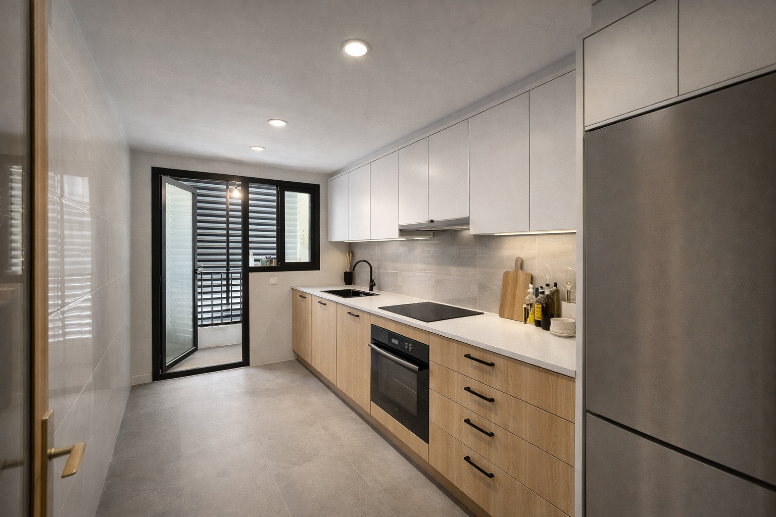 The living-dining room is exterior and overlooks a single street, with unobstructed views of the building opposite, allowing plenty of natural light to enter. The kitchen has a balcony, which can be opened to allow more light in, improving the brightness of the space.