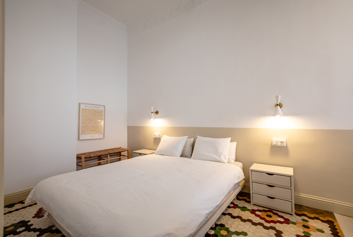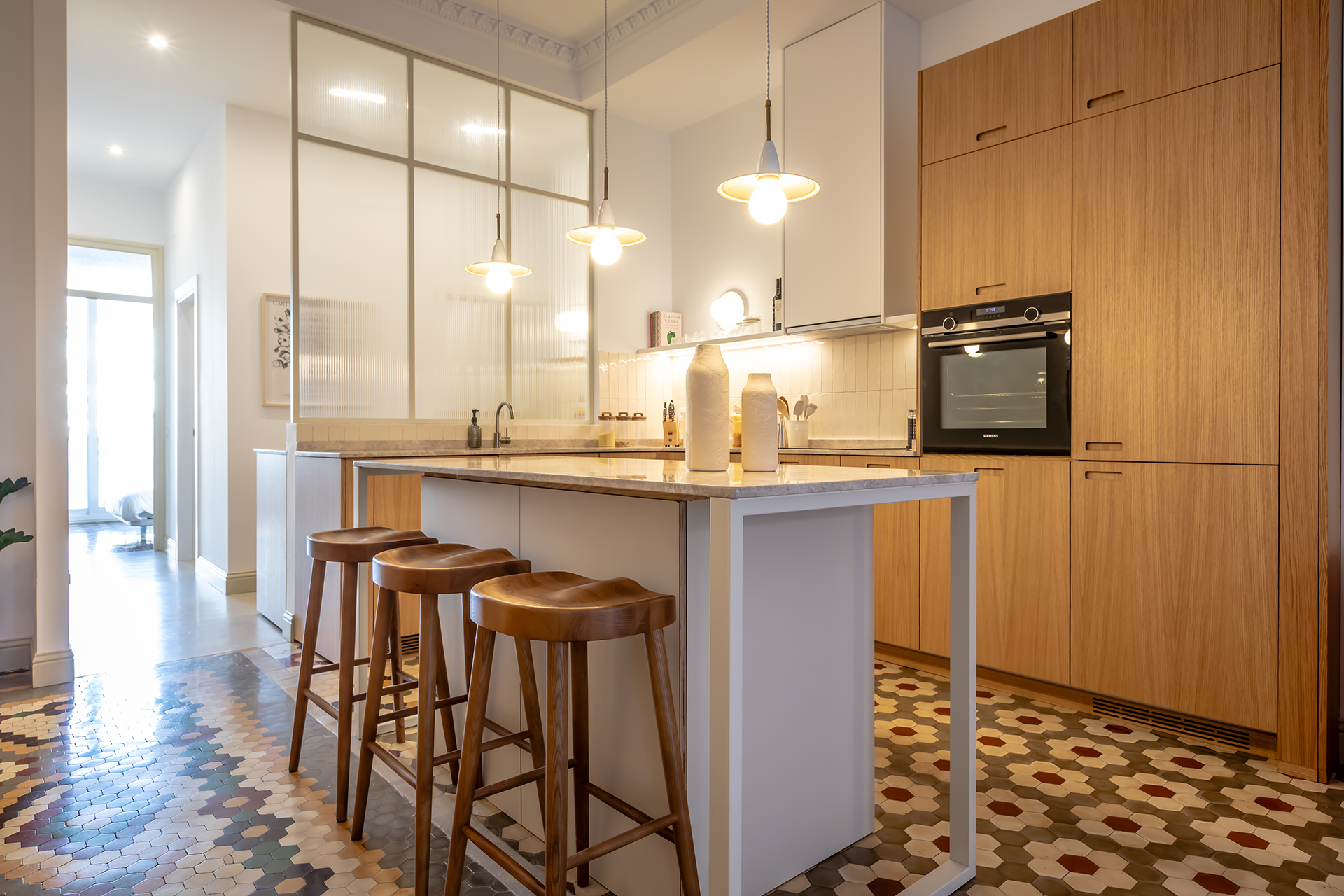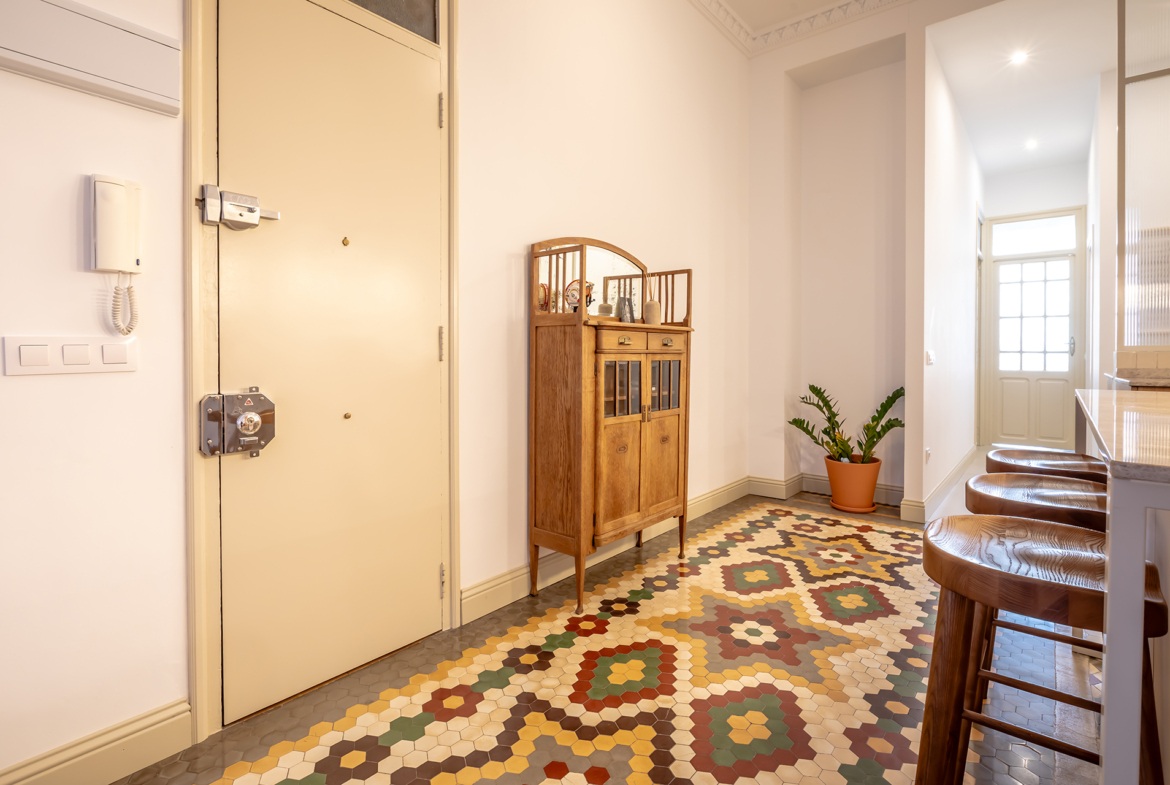 Original antique hydraulic floors have been carefully rehabilitated and restored to excellent condition, preserving the soul of the property. The impressive 3.35-meter-high ceilings, adorned with beautiful decorative detailing, enhance the sense of space, light, and elegance throughout.