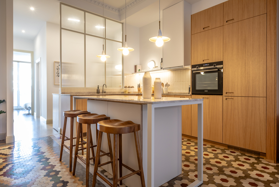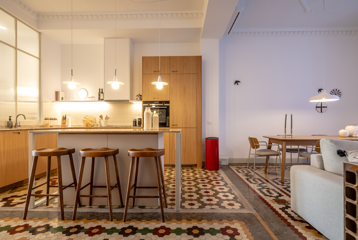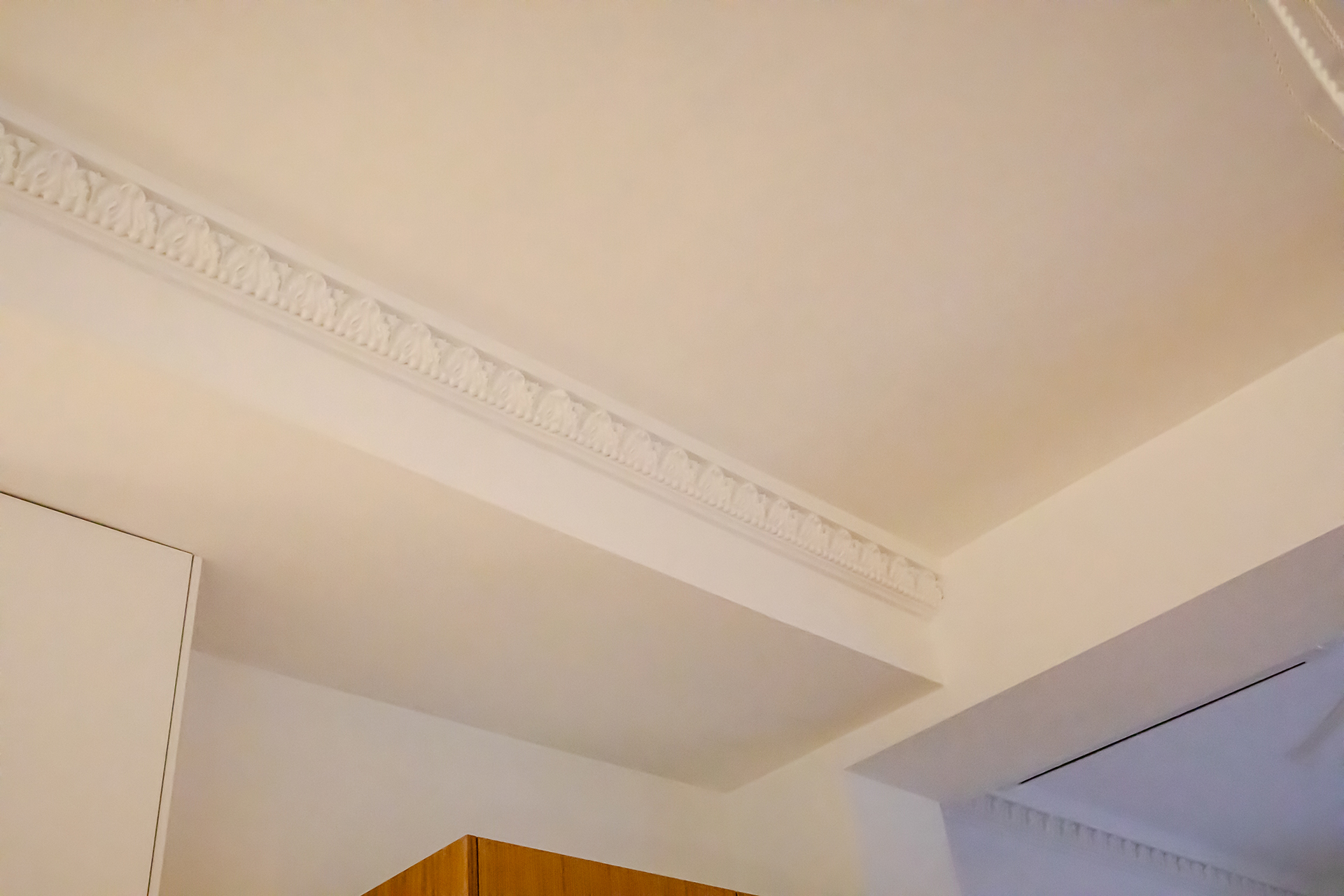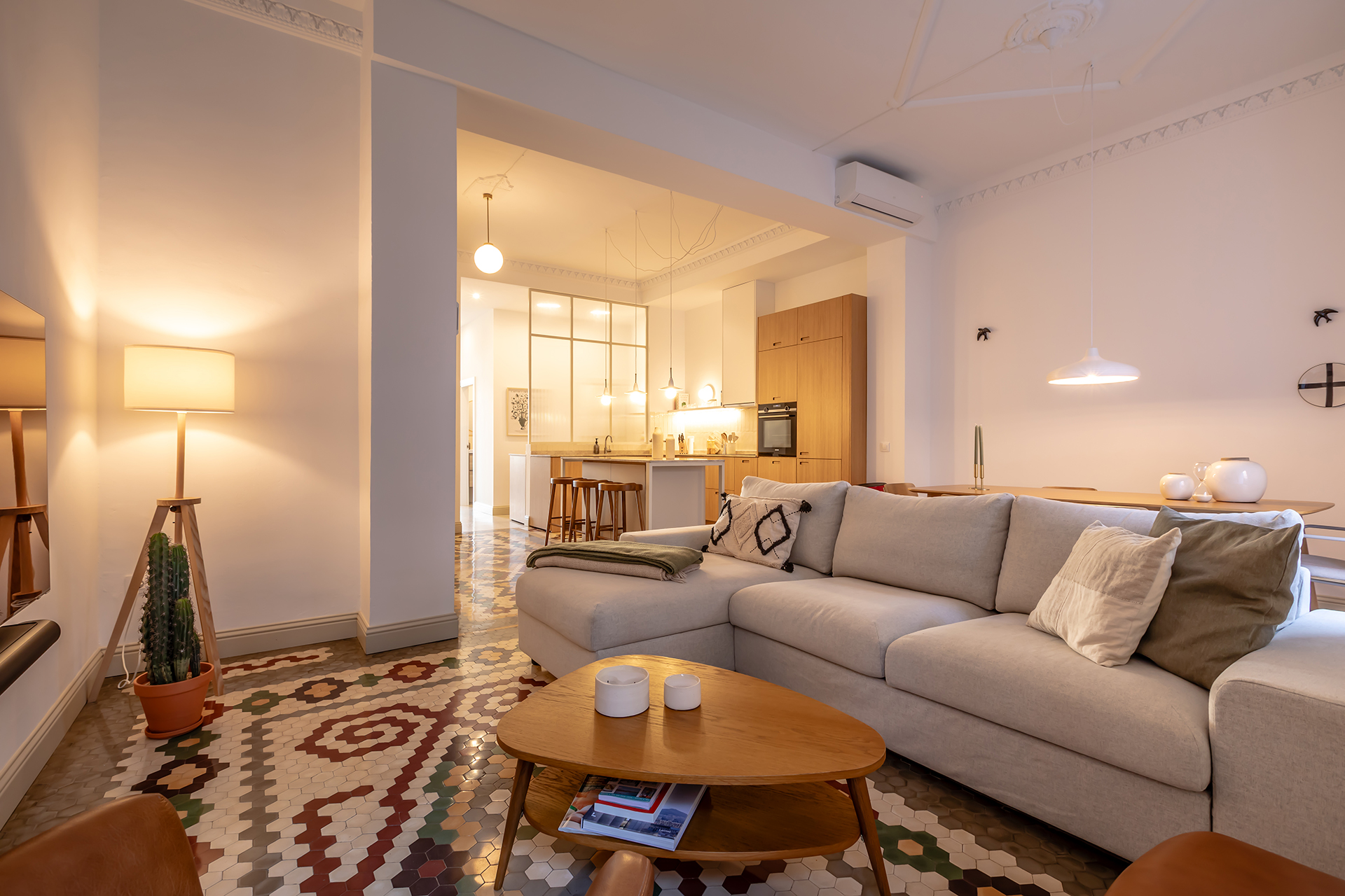 Original antique hydraulic floors have been carefully rehabilitated and restored to excellent condition, preserving the soul of the property. The impressive 3.35-meter-high ceilings, adorned with beautiful decorative detailing, enhance the sense of space, light, and elegance throughout.