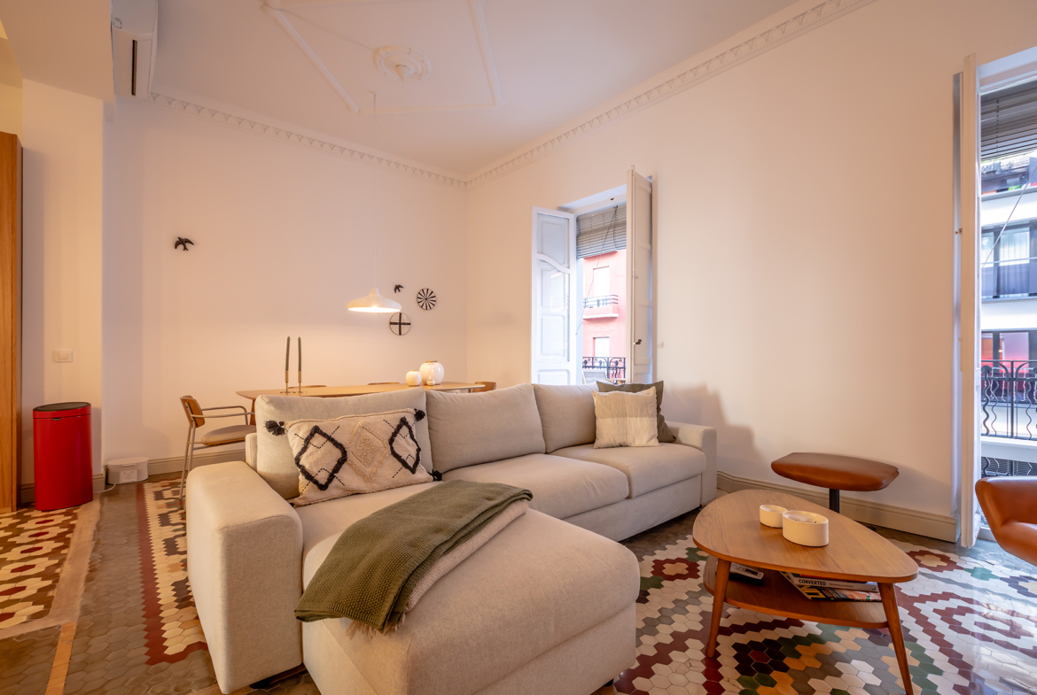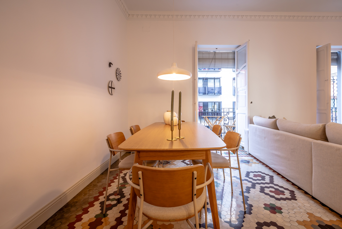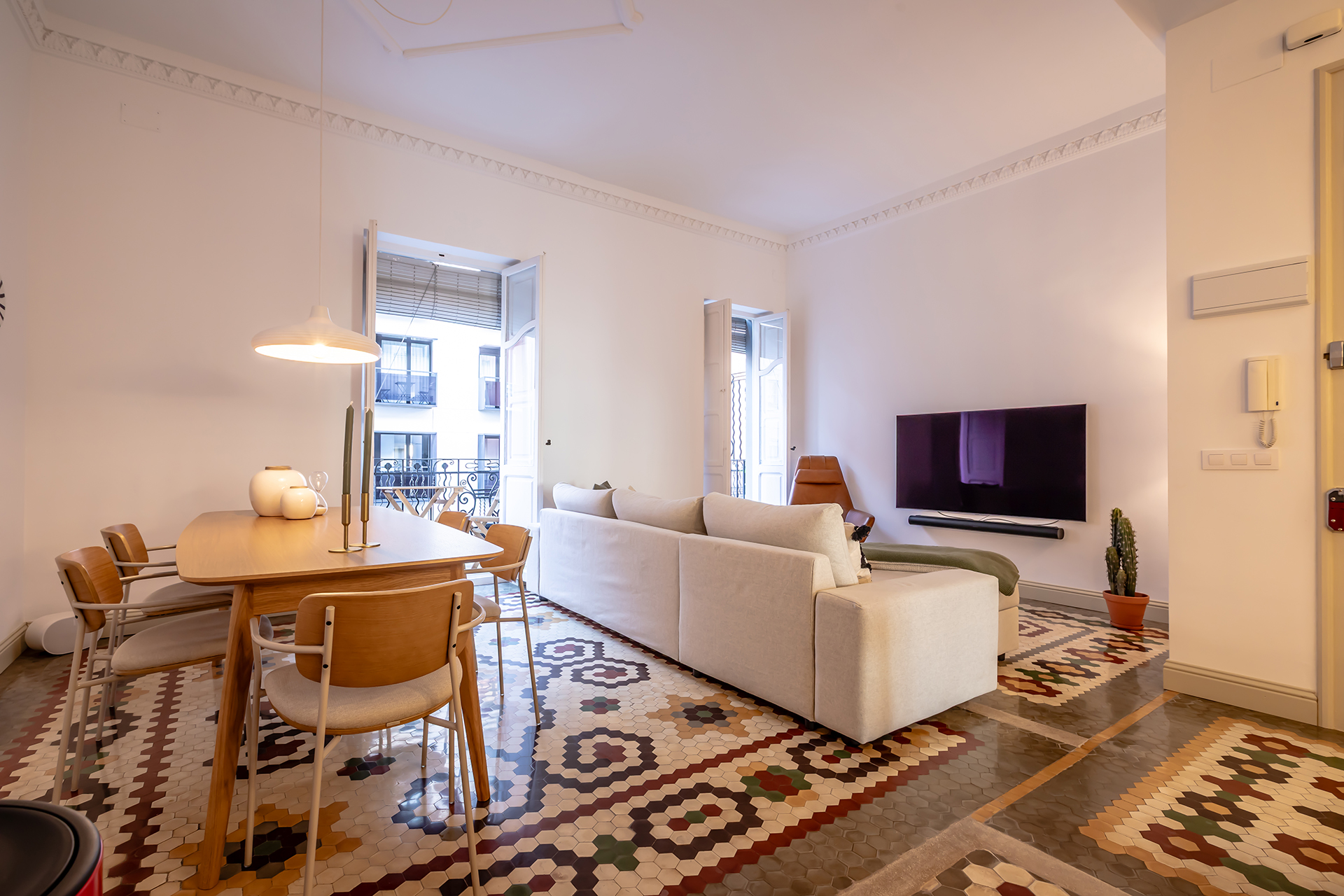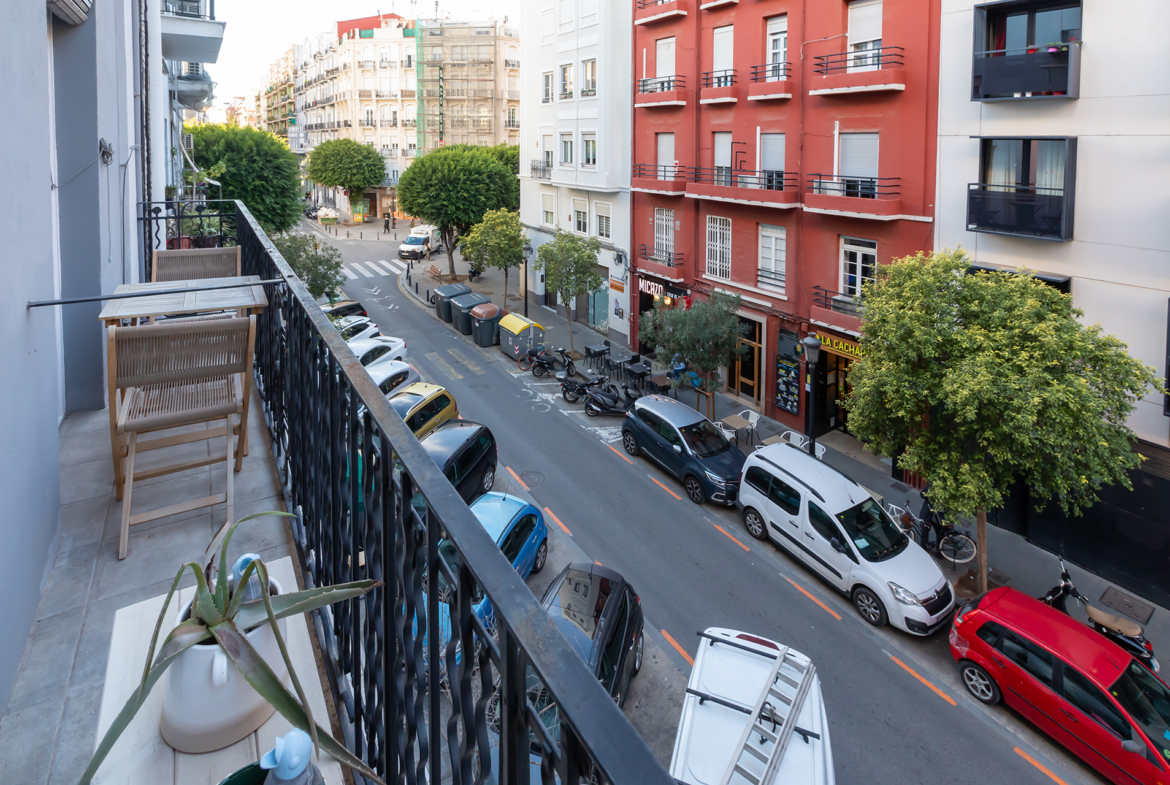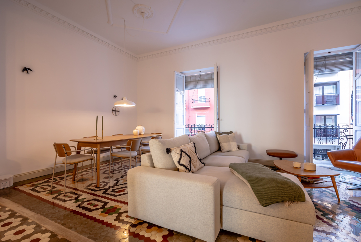 The living and dining area opens onto two charming balconies, offering views over the lively Calle Sueca, bringing natural light and the energy of the neighborhood into the home.