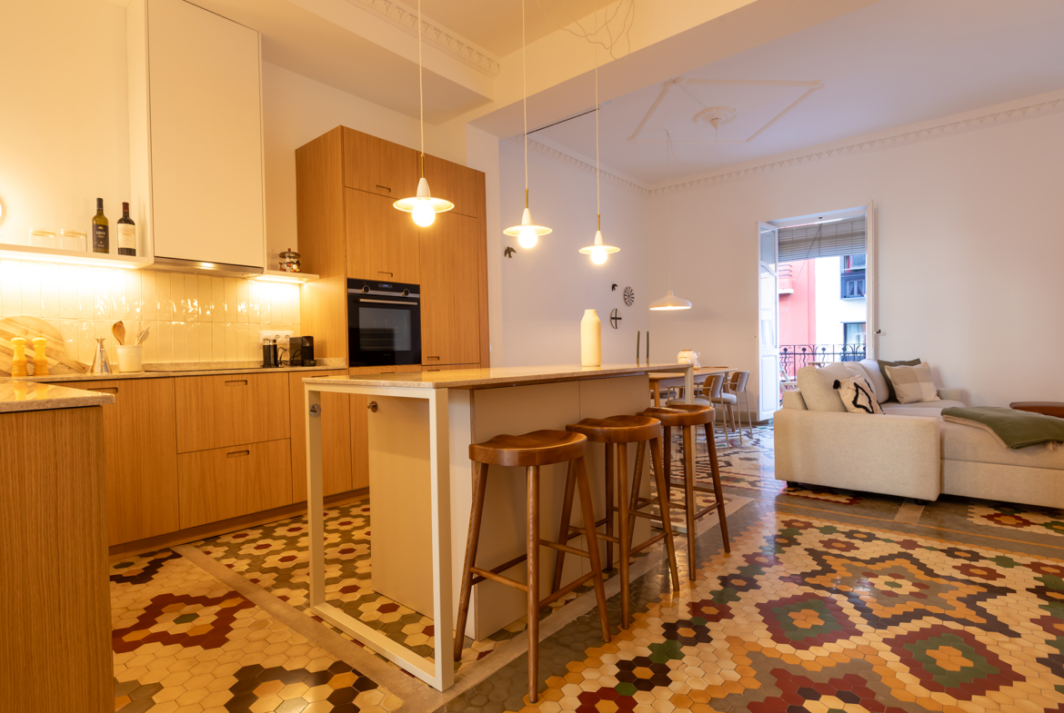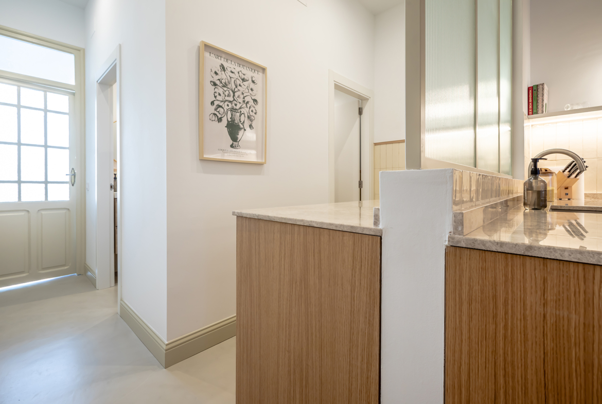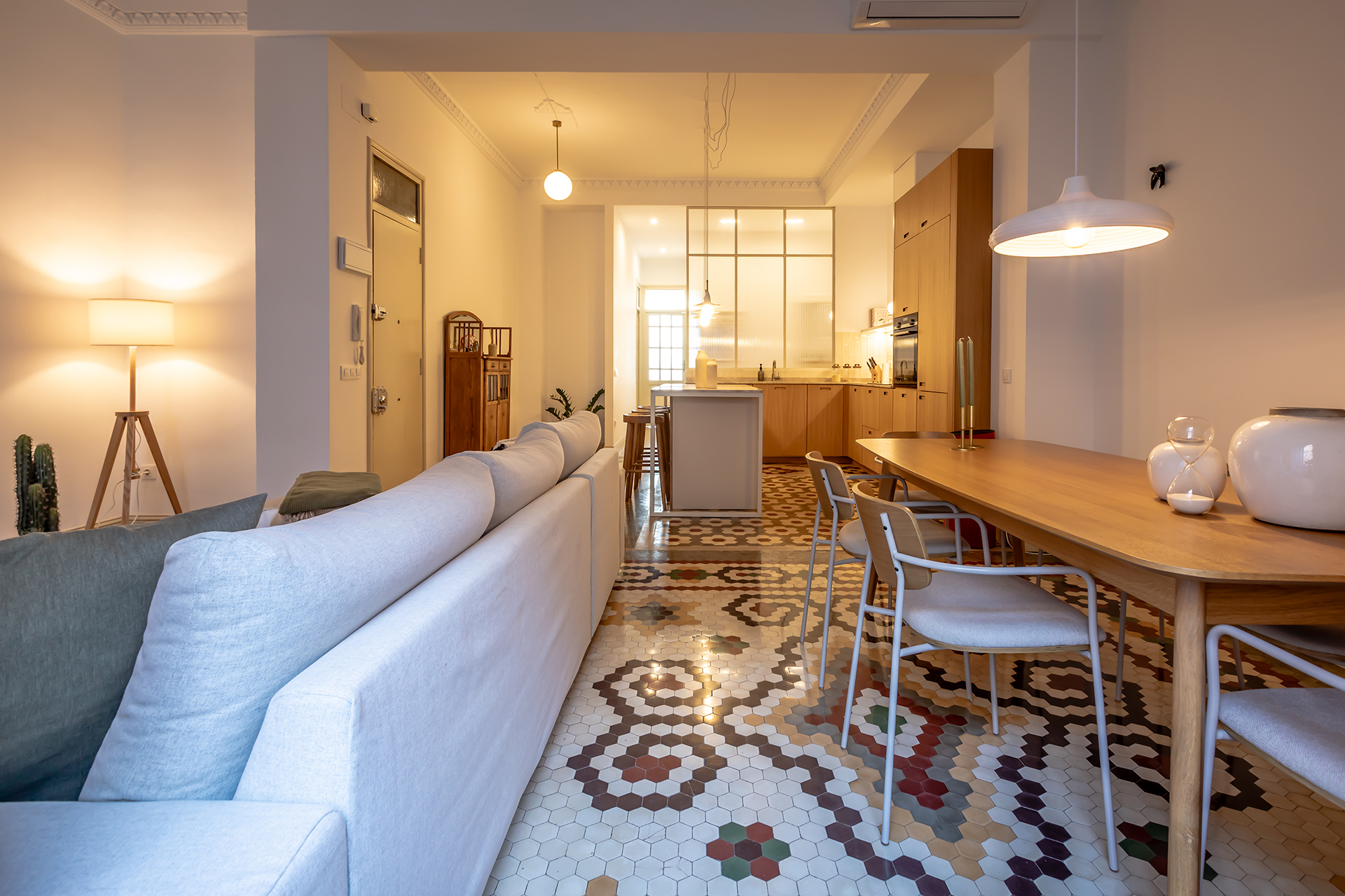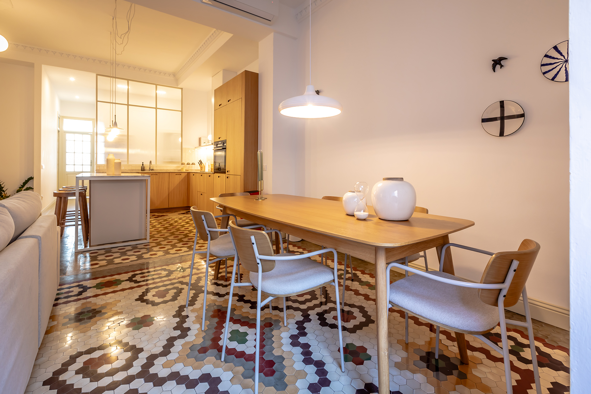 The living and dining area opens onto two charming balconies, offering views over the lively Calle Sueca, bringing natural light and the energy of the neighborhood into the home.