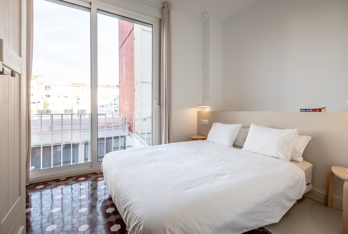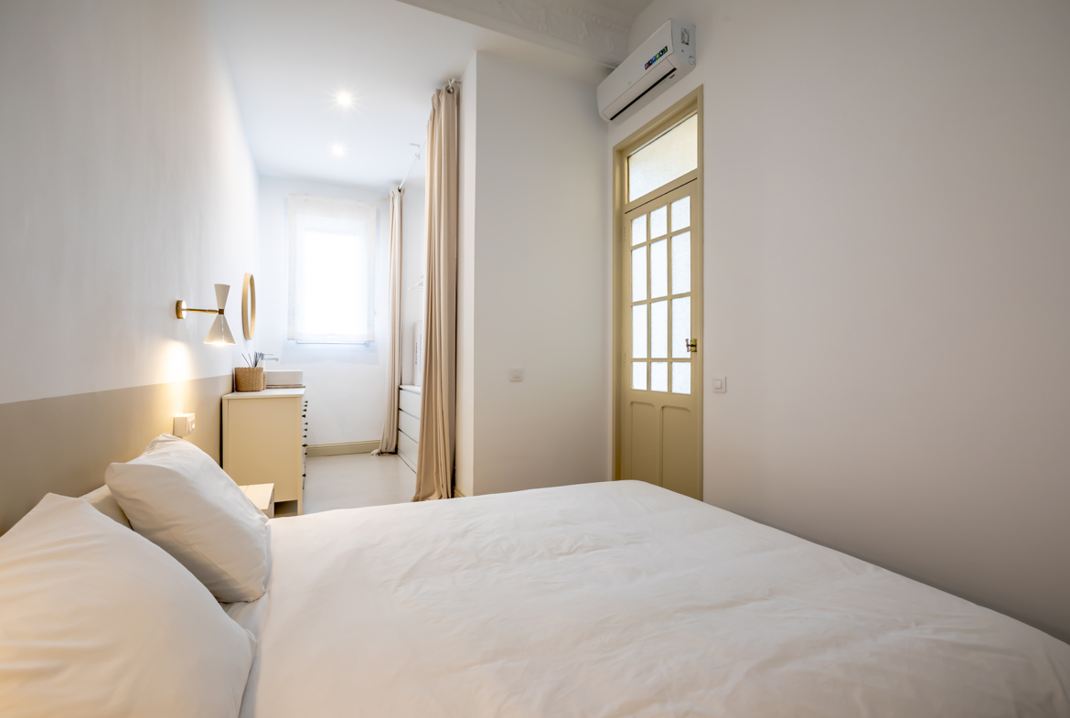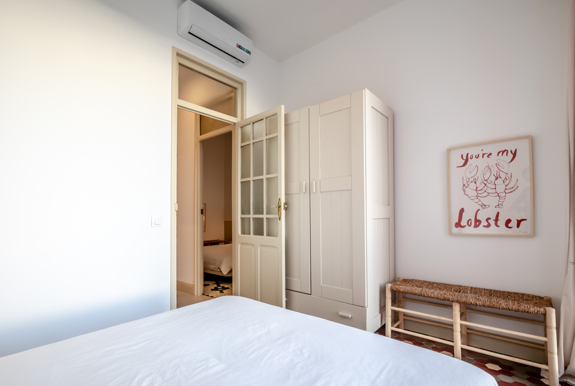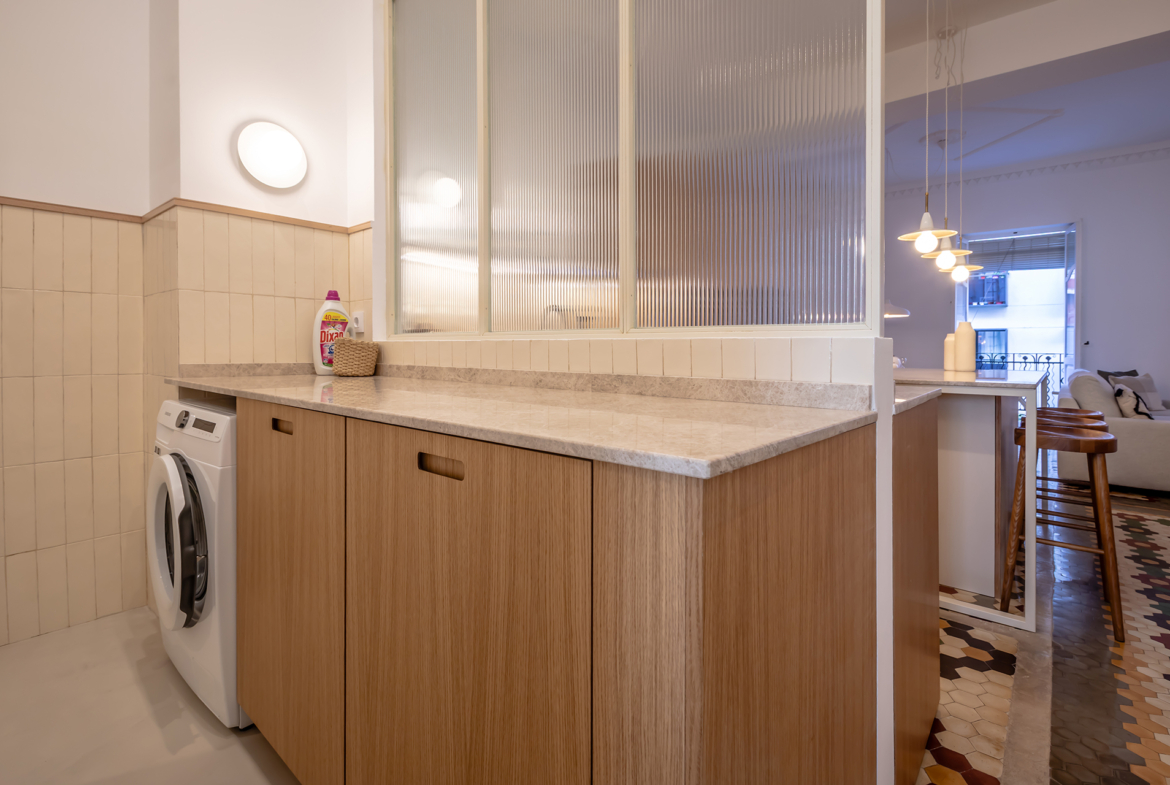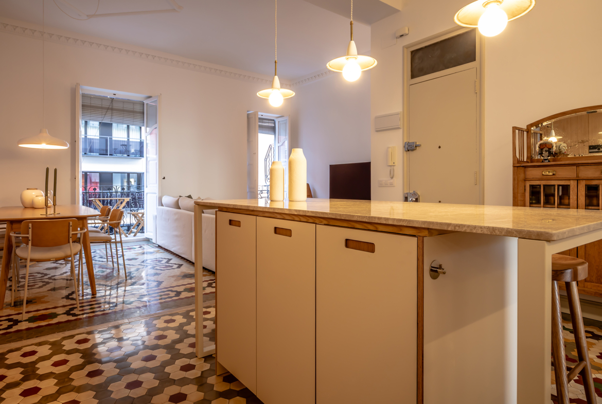 The living and dining area opens onto two charming balconies, offering views over the lively Calle Sueca, bringing natural light and the energy of the neighborhood into the home.