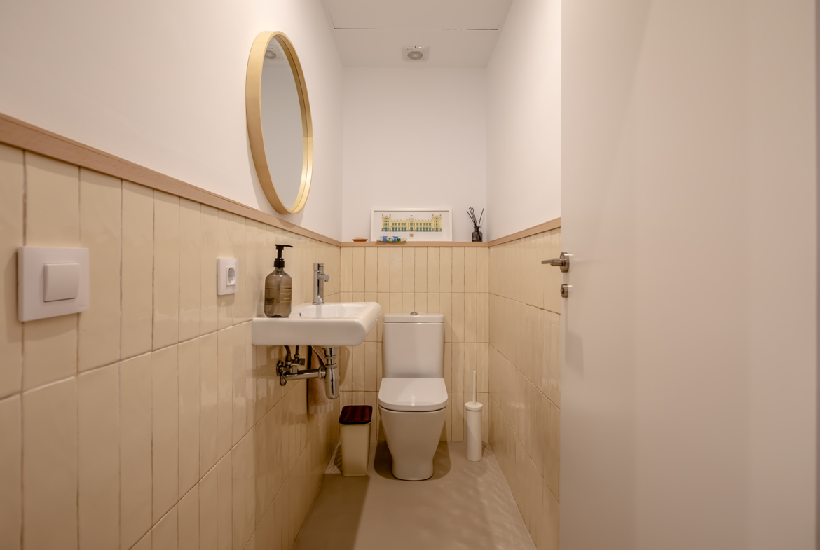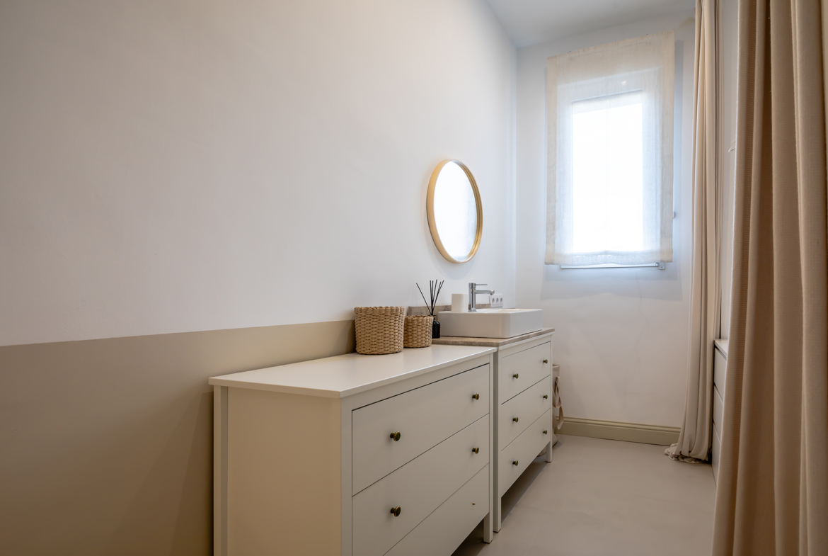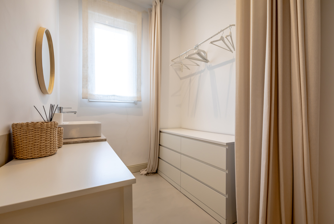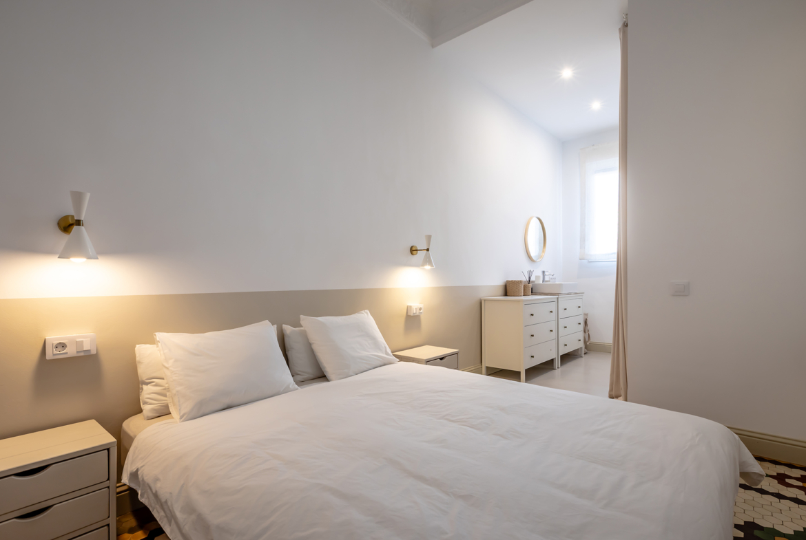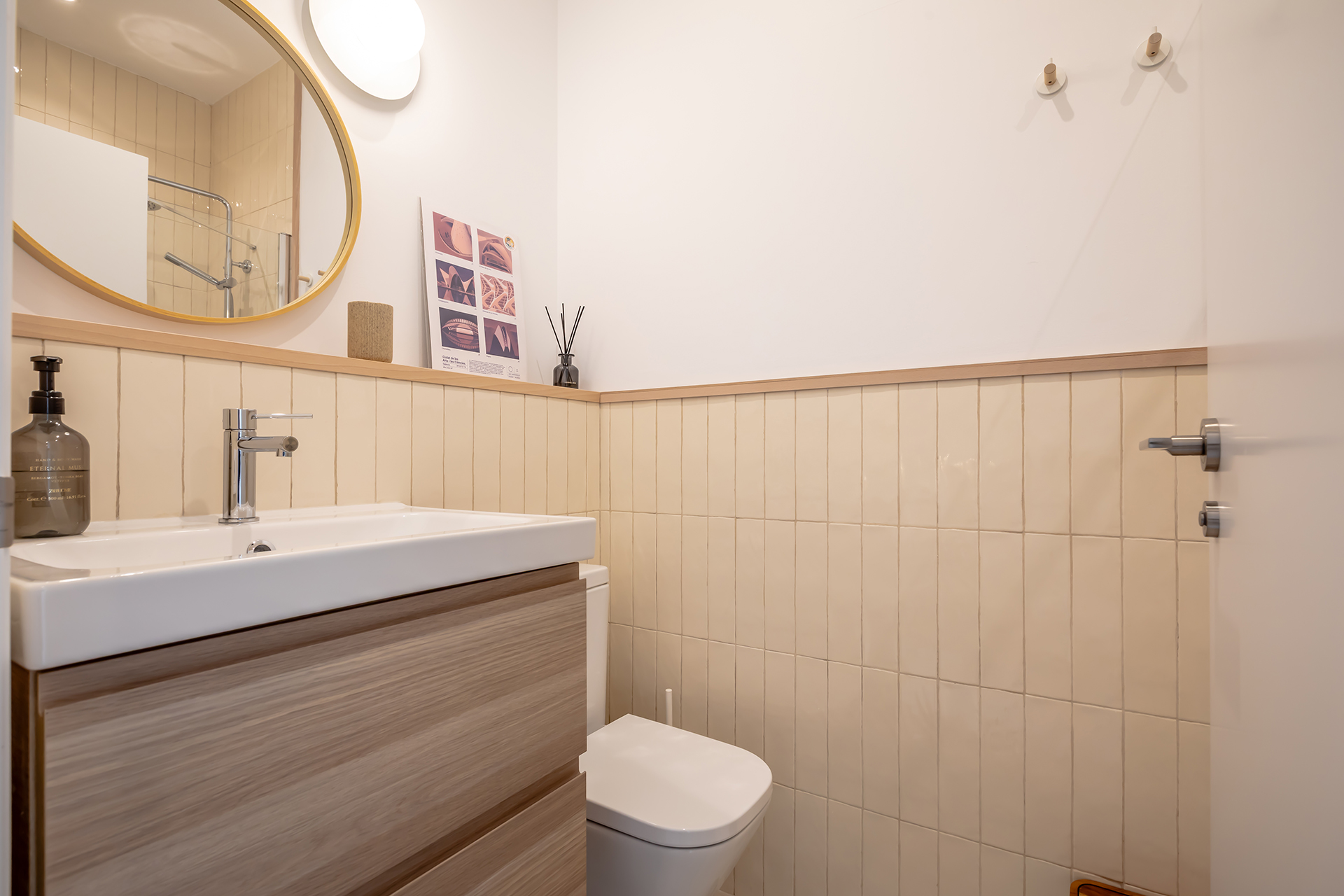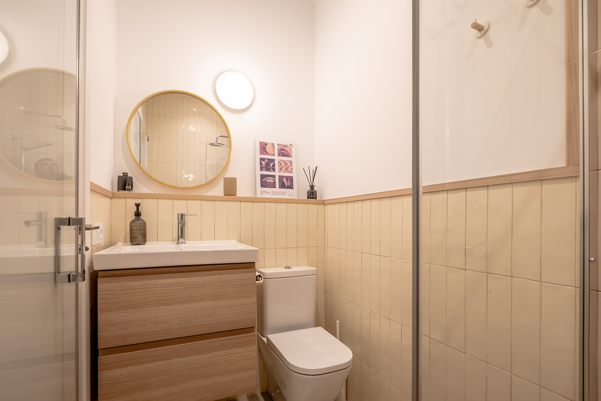 The property features 2 double bedrooms and 1.5 bathrooms, thoughtfully designed for both comfort and style. The master bedroom stands out with its private sink, adding a boutique-hotel touch and extra functionality.