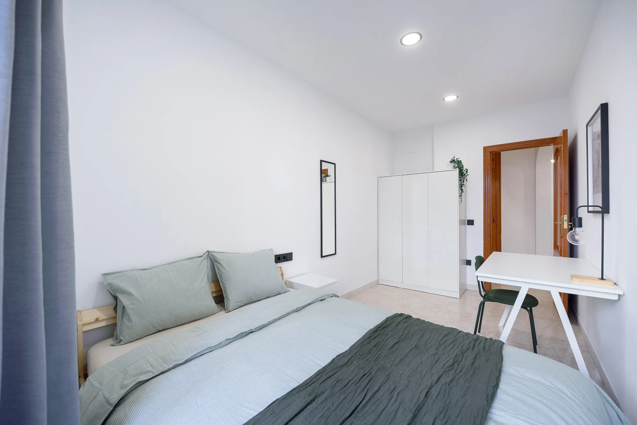 This 11m² room in a charming 4-bedroom apartment on Calle Baja 30 offers a bright, comfortable space with a private balcony perfect for enjoying your morning coffee or getting some fresh air. The room comes furnished with a double bed, a large wardrobe, and a desk and chair, making it ideal for studying or remote work.