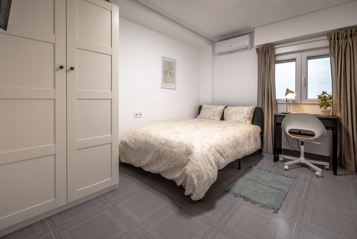 The room is thoughtfully equipped with a comfortable double bed, TV, air conditioning, a wardrobe, and a desk with chair, making it ideal for both studying and working from home.