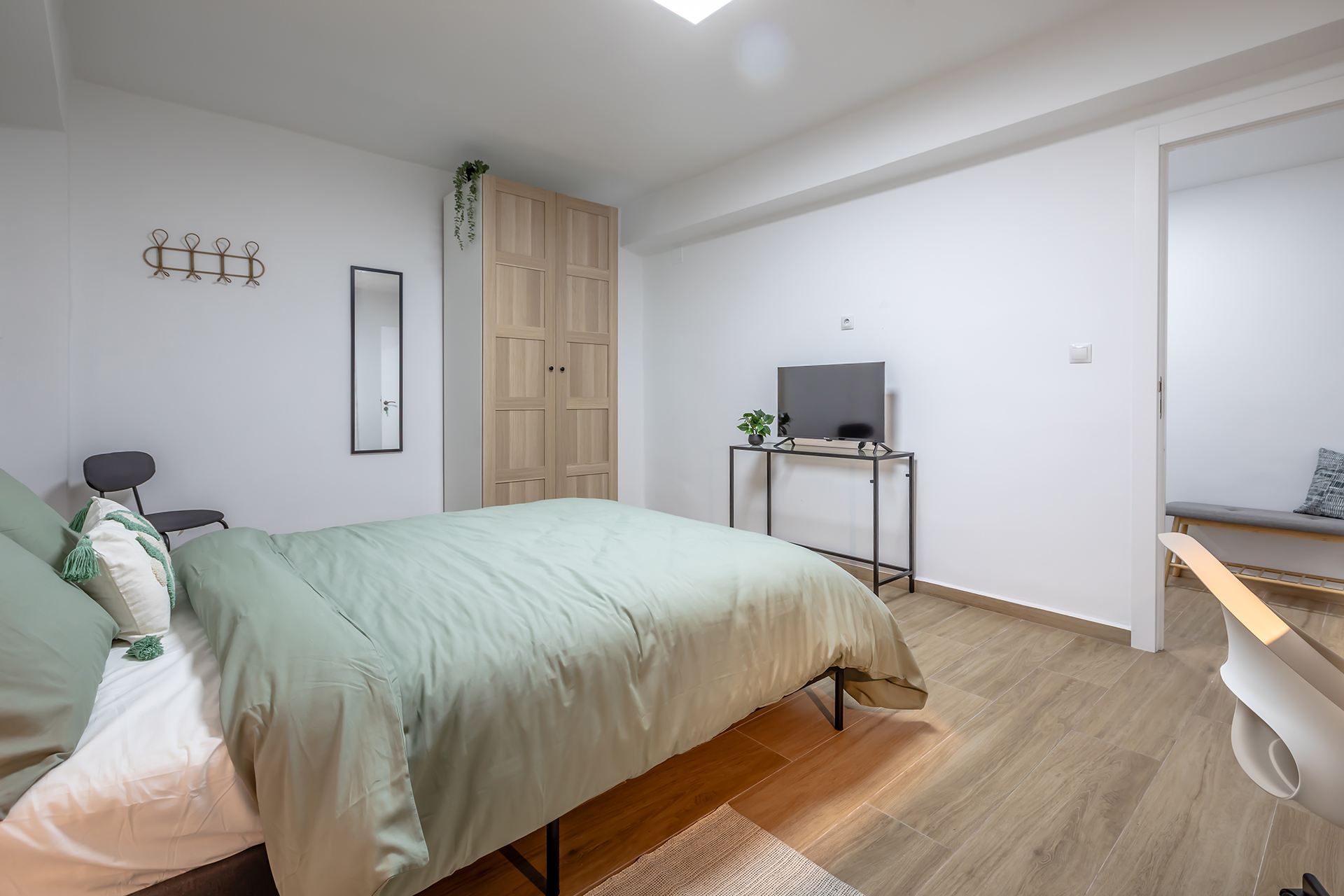 The room is thoughtfully equipped with a comfortable double bed, spacious wardrobe, TV, air conditioning, and a desk with chair, making it ideal for studying, remote work, and relaxing.