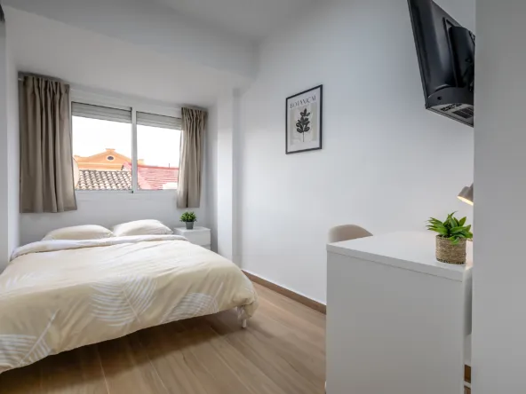 This 9m² room in a stylish 5-bedroom apartment on Calle Jose Melia Pigmalion 4 is the perfect blend of comfort and convenience. The room comes fully furnished with a comfortable double bed, a large wardrobe, a desk and chair for work or study, and your own TV ideal for relaxing in your own space.