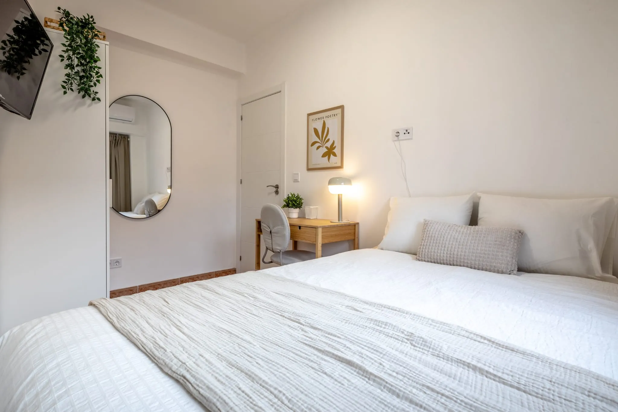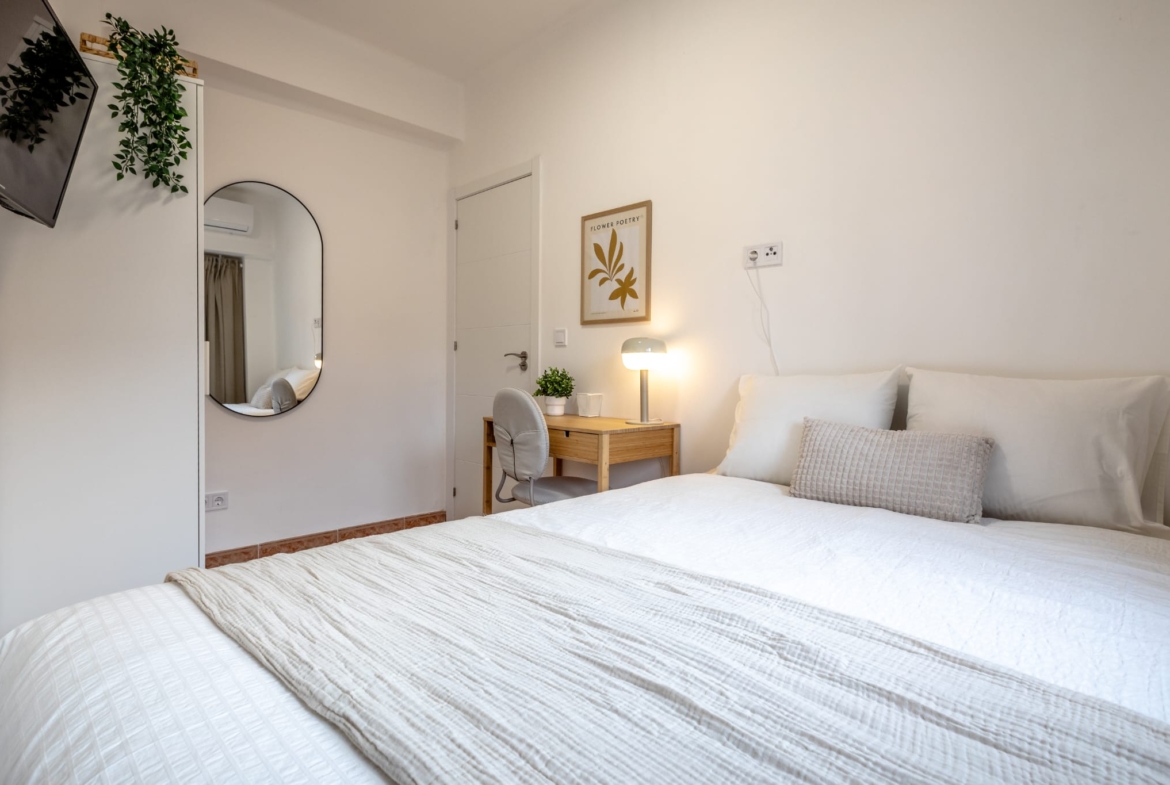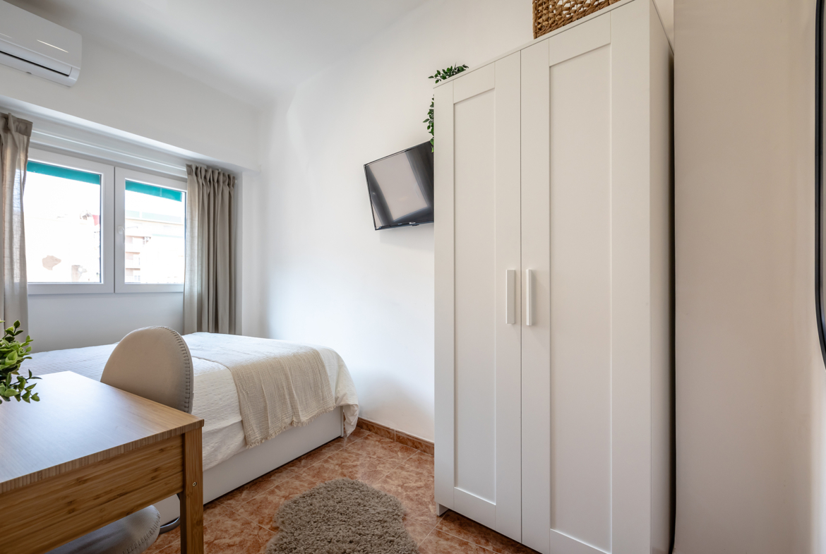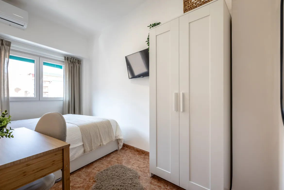 This 8m² room in a stylish 5-bedroom apartment on Calle Mendizabal 48 is the perfect blend of comfort and convenience. The room comes fully furnished with a comfortable double bed, a large wardrobe, a desk and chair for work or study, and your own TV ideal for relaxing in your own space.