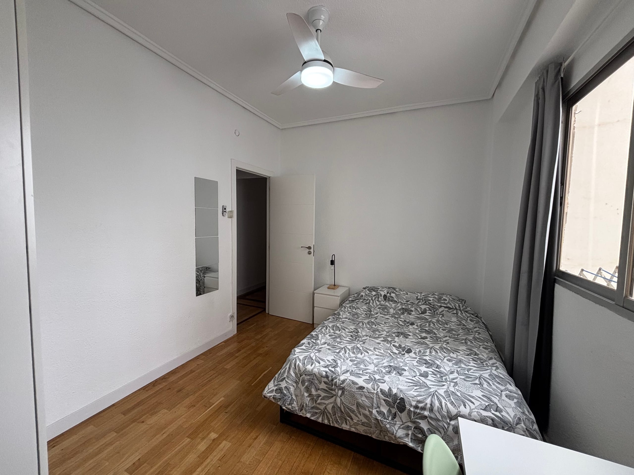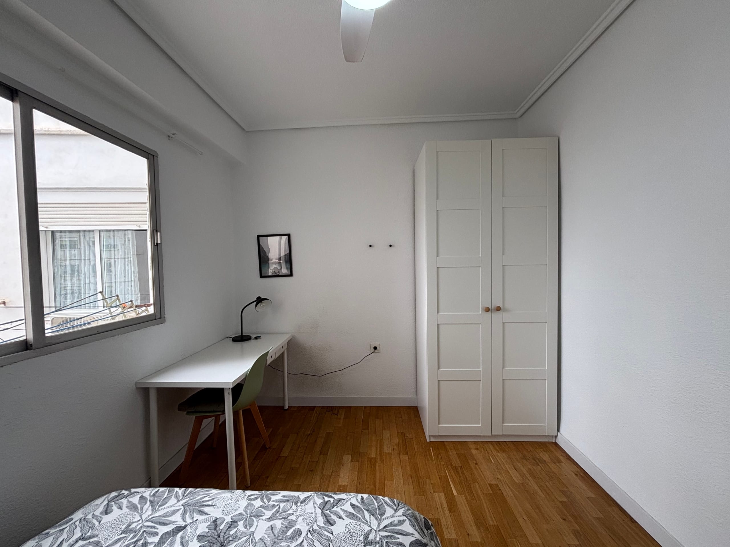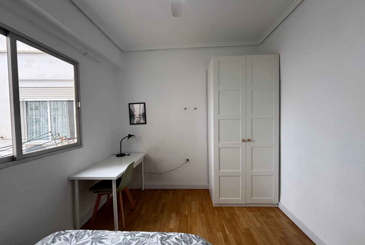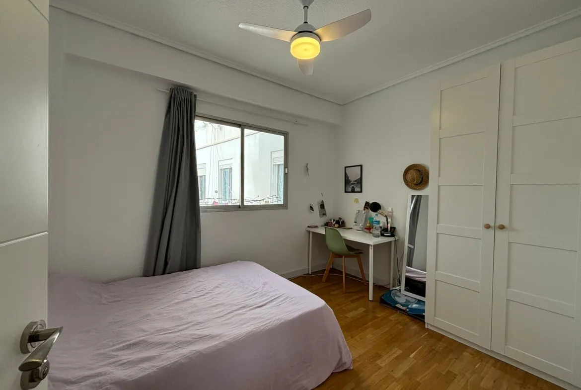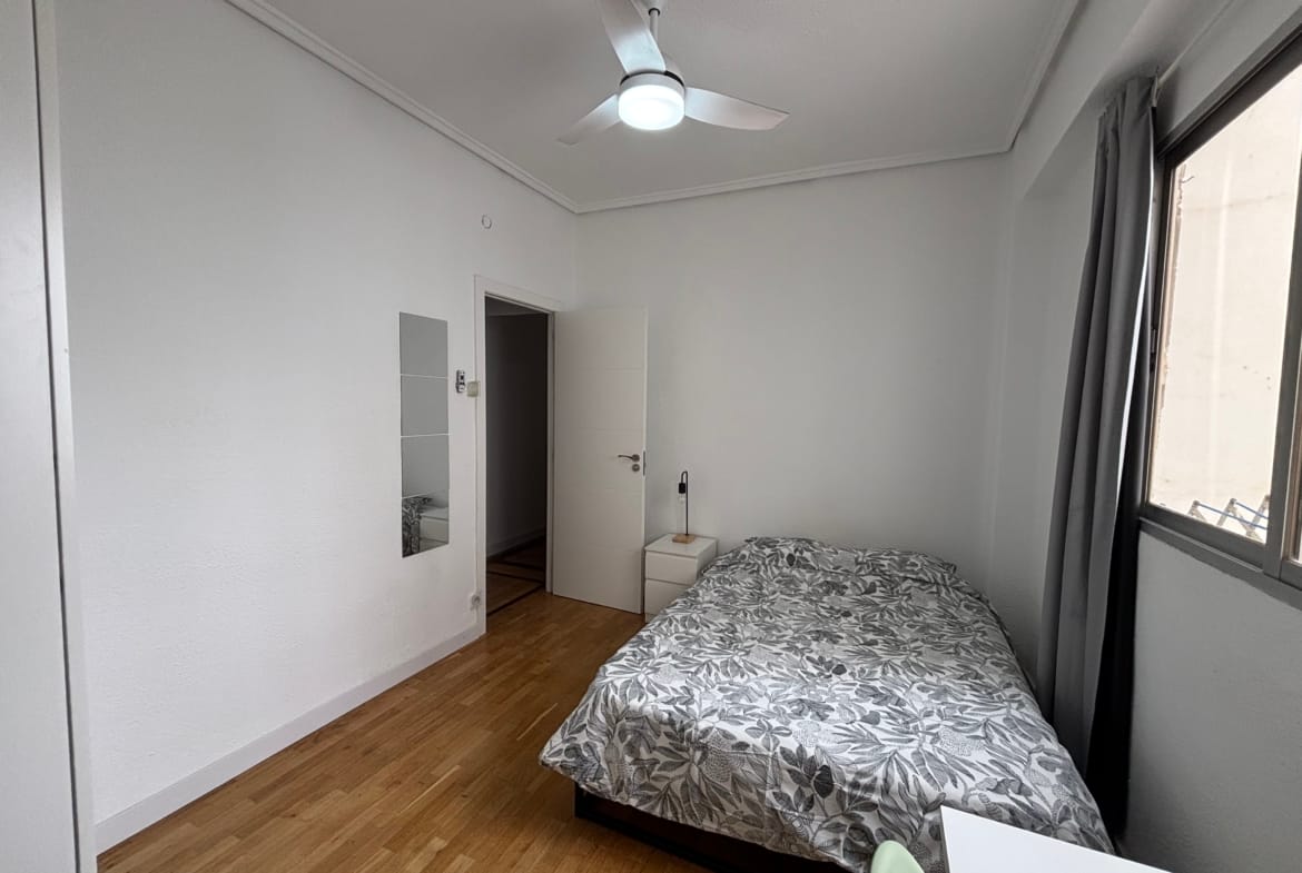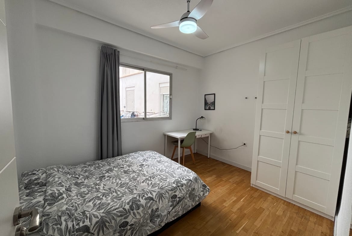 This 12m² room in a bright and spacious 3-bedroom apartment on Calle Peris Brell 33 offers a comfortable and practical living space, ideal for students or young professionals. The room comes furnished with a double bed, a large wardrobe, and a desk and chair perfect for studying or working from home. A ceiling fan ensures a cool and pleasant atmosphere throughout the warmer months.