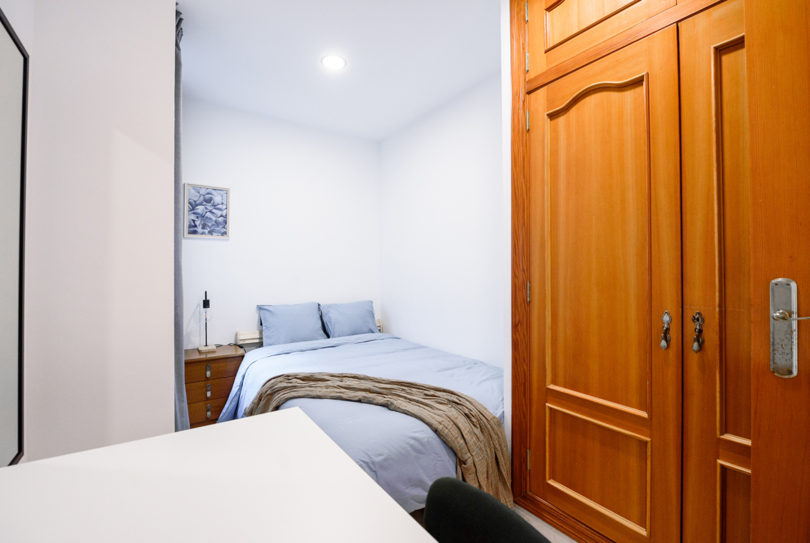 This 9m² room in a charming 4-bedroom apartment on Calle Baja 30 offers a bright, functional space designed for comfortable living. It comes furnished with a double bed, a large wardrobe, and a desk and chair ideal for studying or working from home.