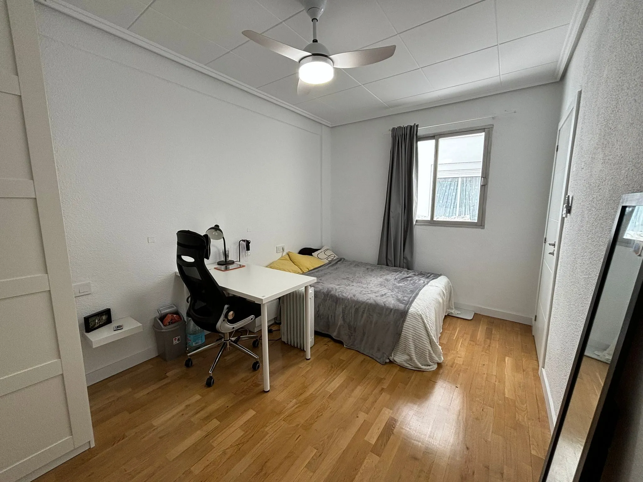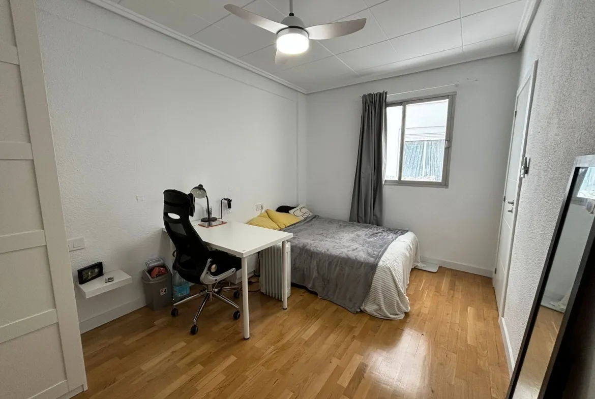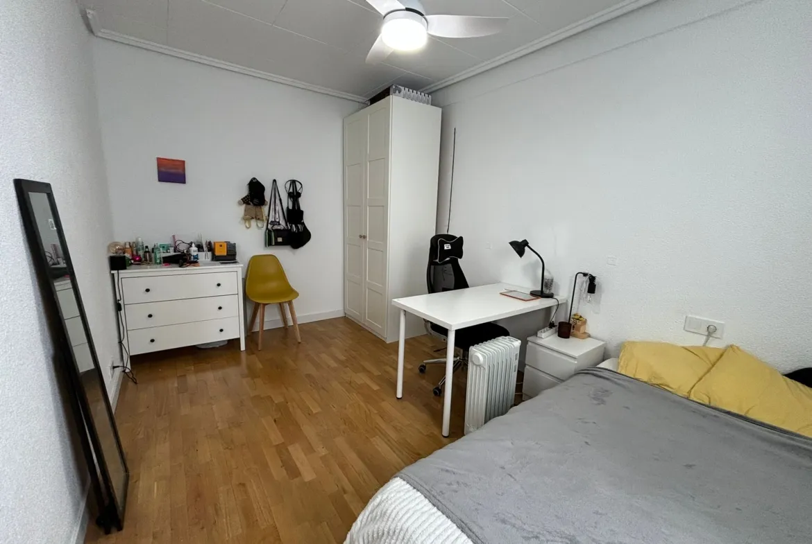 This 14m² room in a bright and spacious 3-bedroom apartment on Calle Peris Brell 33 offers a comfortable and practical living space, ideal for students or young professionals. The room comes furnished with a double bed, a large wardrobe, and a desk and chair perfect for studying or working from home. A ceiling fan ensures a cool and pleasant atmosphere throughout the warmer months.